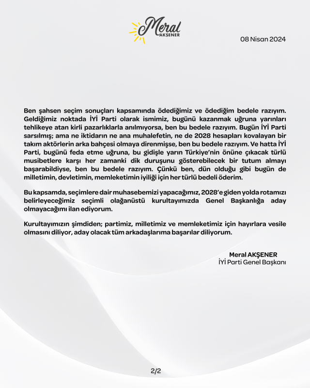 Akşener, “Seçim sonuçları kapsamında ödediğimiz ve ödediğim bedele razıyım. Geldiğimiz noktada İYİ Parti olarak ismimiz, bugünü kazanmak uğruna yarınları tehlikeye atan kirli pazarlıklarla anılmıyorsa, ben bu bedele razıyım. Bugün İYİ Parti sarsılmış; ama ne iktidarın ne ana muhalefetin, ne de 2028 hesapları kovalayan bir takım aktörlerin arka bahçesi olmaya direnmişse, ben bu bedele razıyım. Ve hatta İYİ Parti, bugünü feda etme uğruna, bu gidişle yarın Türkiye’nin önüne çıkacak türlü musibetlere karşı her zamanki dik duruşunu gösterebilecek bir tutum almayı başarabildiyse, ben bu bedele razıyım. Çünkü ben, dün olduğu gibi bugün de milletimin, devletimin, memleketimin iyiliği için her türlü bedeli öderim.